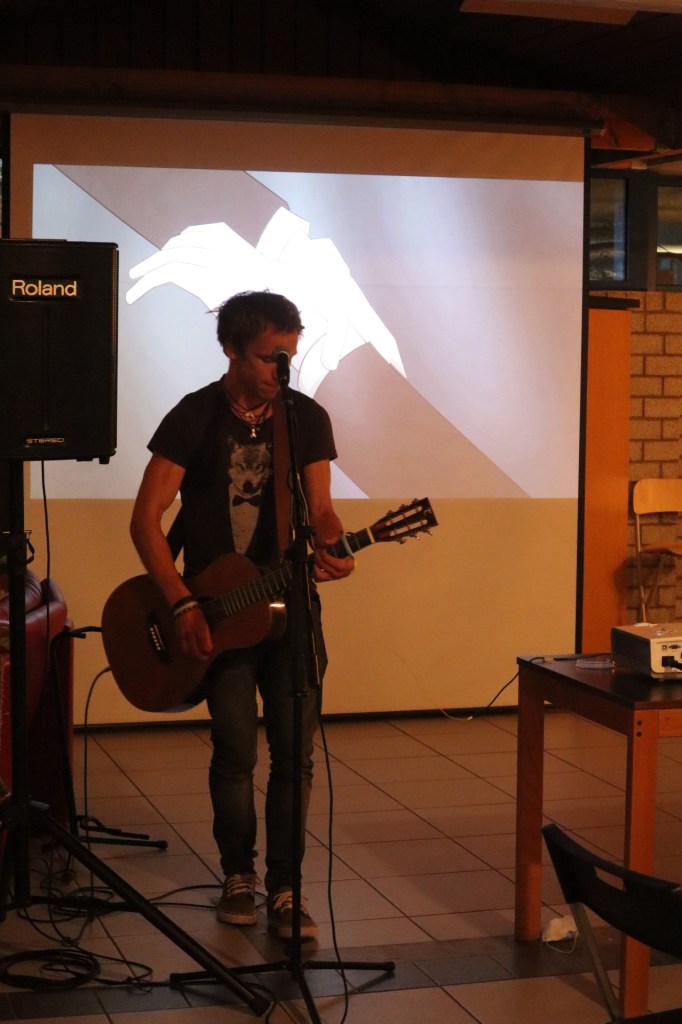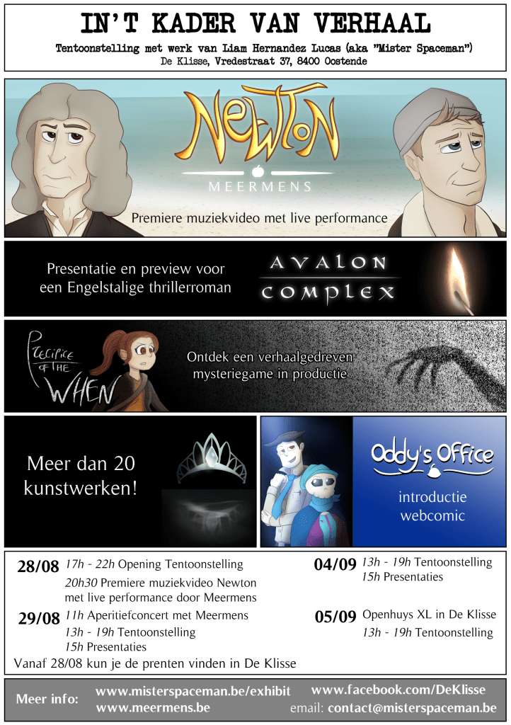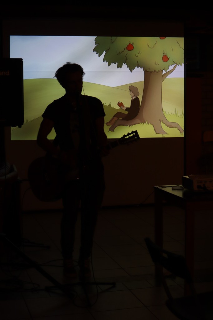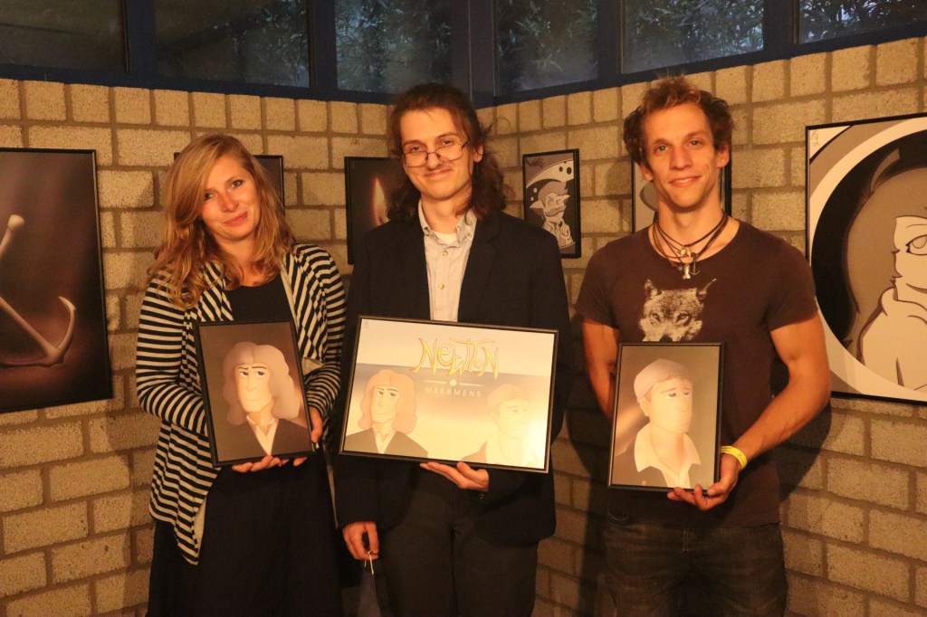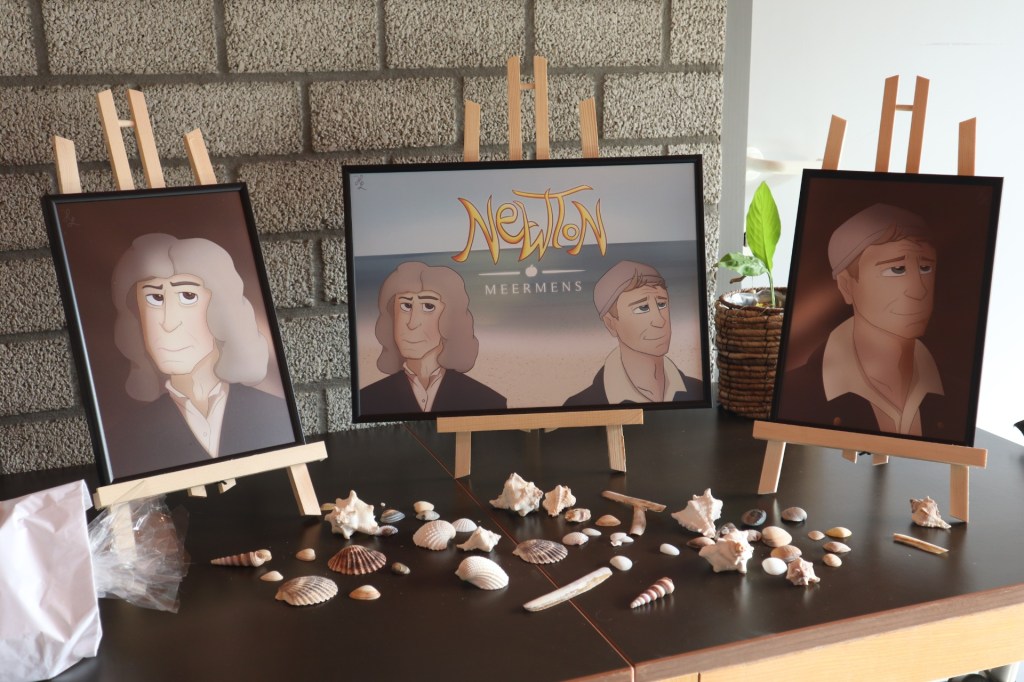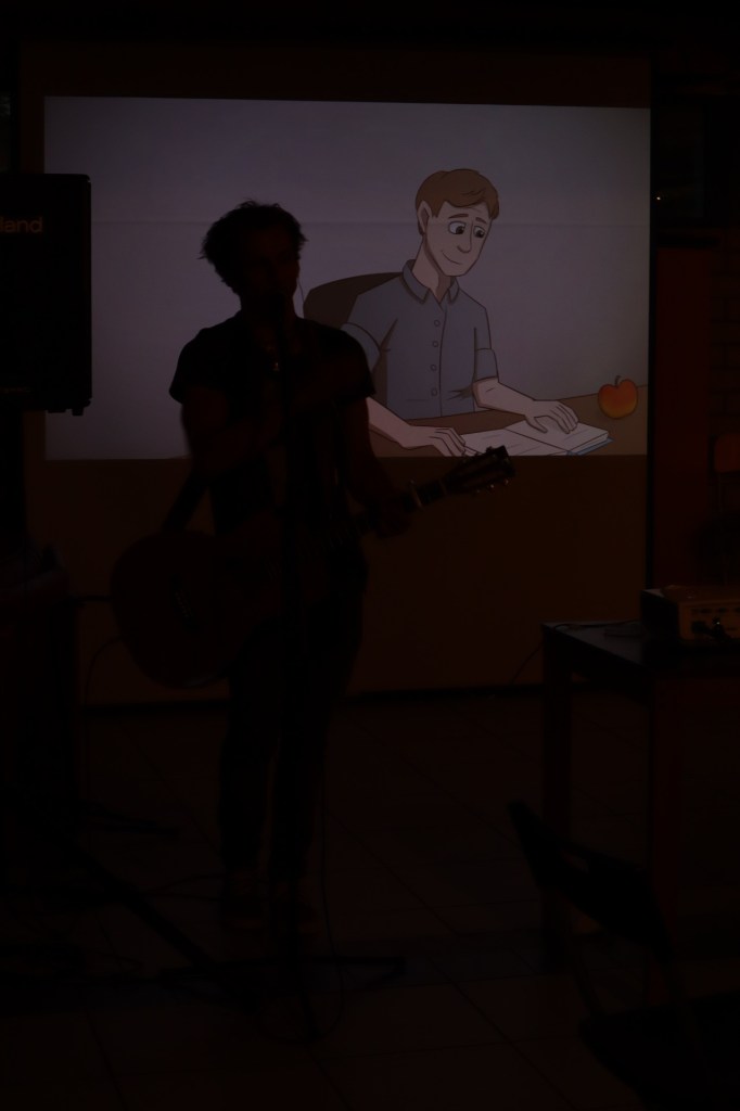 But of course, that’s not all. There’s still the most epic part of the exhibit: The collaboration with Meermens, Belgian Kleinkunst singer and all around awesome guy. He did a live performance of his new song Newton, in sync with a music video I animated for the song. It was my first time working on a project this size, and making an animation of such a length. It was a great experience.