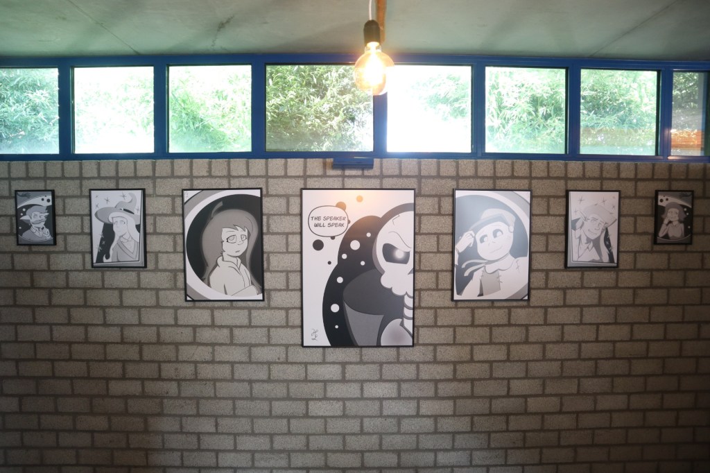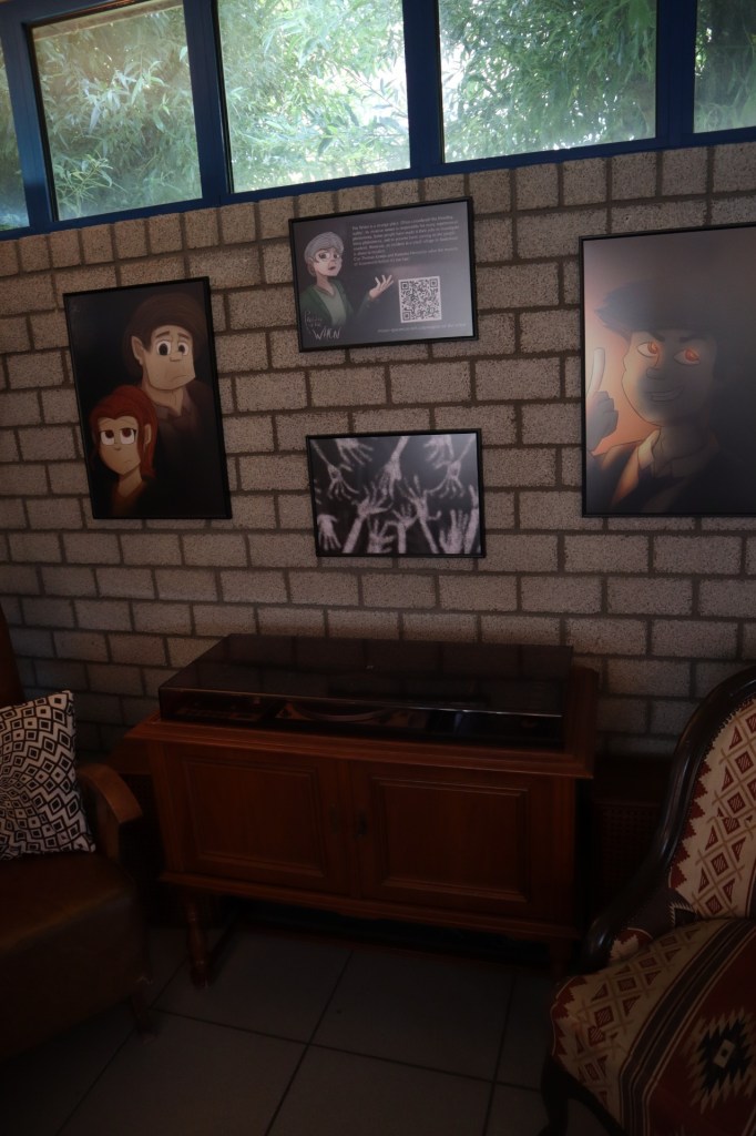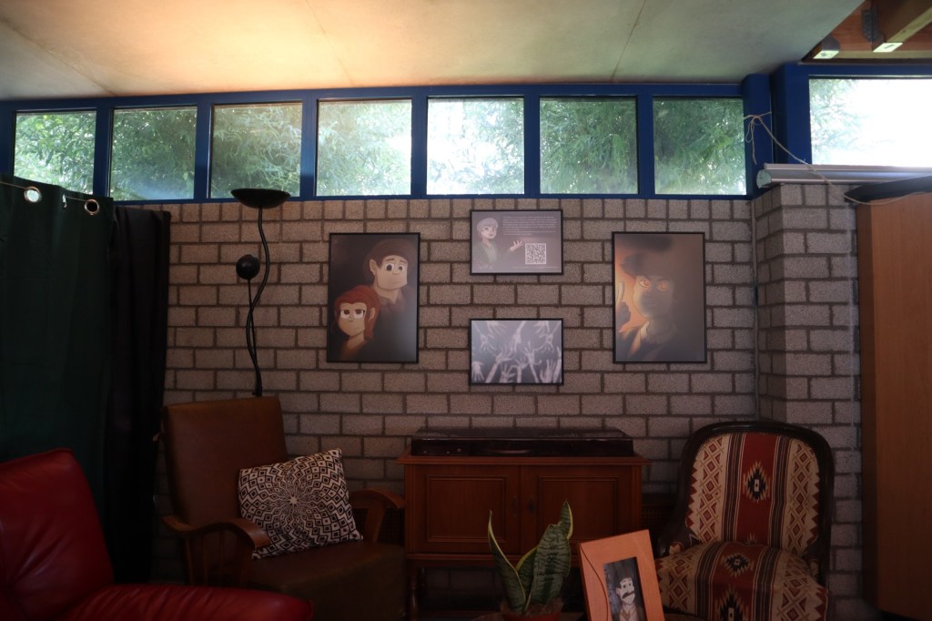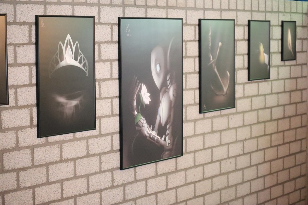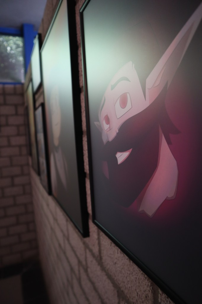 The works were divided into four parts: The Oddy wall, the Oddy Monochrome wall, the Dark wall and the When wall. For the When wall, we used present furniture and some added extras to give it a salon feel that fit the tone of the Precipice of the When game. In the salon, we also put a small laptop with the demo for Precipice of the When. We also hooked up a projector for various images.