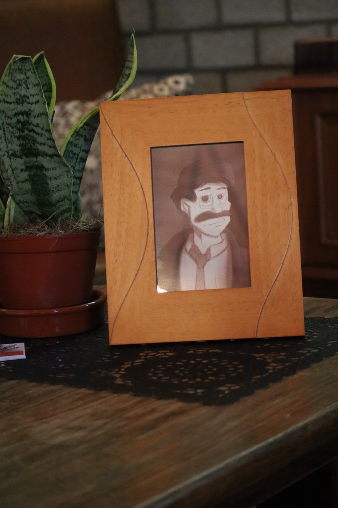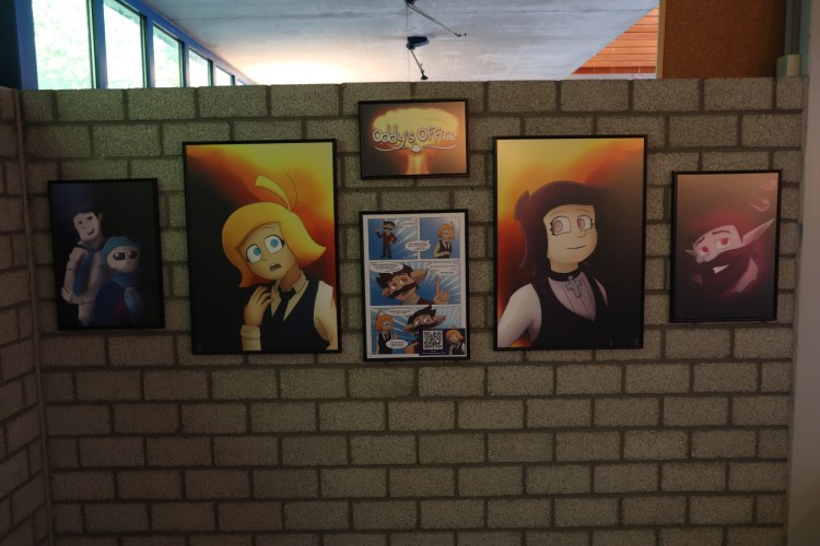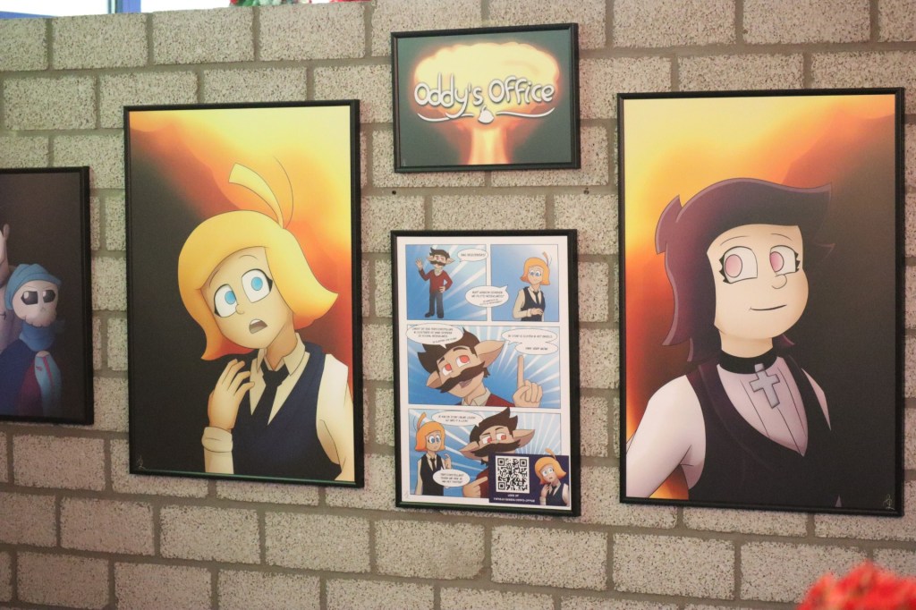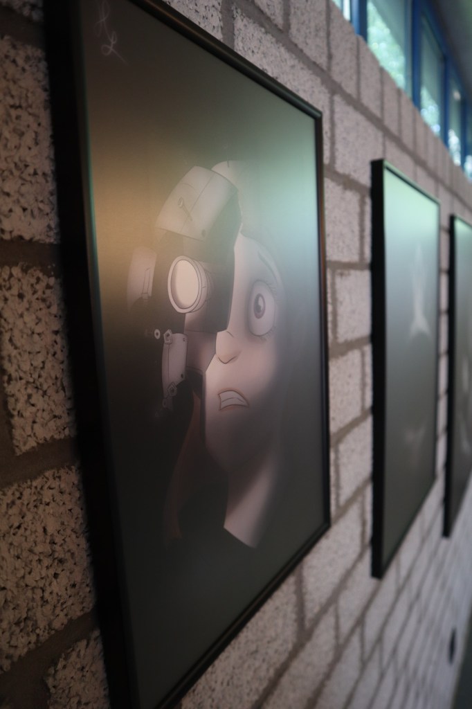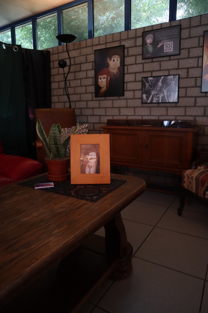 The works were divided into four parts: The Oddy wall, the Oddy Monochrome wall, the Dark wall and the When wall. For the When wall, we used present furniture and some added extras to give it a salon feel that fit the tone of the Precipice of the When game. In the salon, we also put a small laptop with the demo for Precipice of the When. We also hooked up a projector for various images.